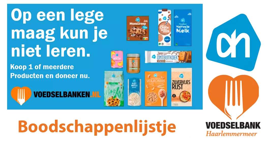 Voedselbank Haarlemmermeer en 6 Albert Heijn filialen doen mee.Ook in Haarlemmermeer zijn kinderen helaas afhankelijk van voedselhulp. De Voedselbank steunt meer dan 1.200 mensen, waarvan meer dan 450 kinderen door wekelijks voedsel te verstrekken uit gedoneerde middelen.